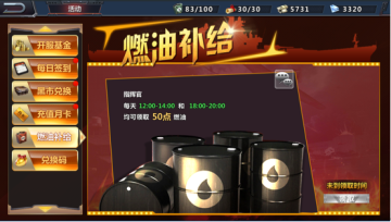 在活动页面里面有一个燃油补给切页,每日的12:00—14:00和18:00—20:00上线的舰长均能领取50点燃油奖励,所以舰长在这两个时间段一定要记得上线,不然可就要落后于其他舰长了。