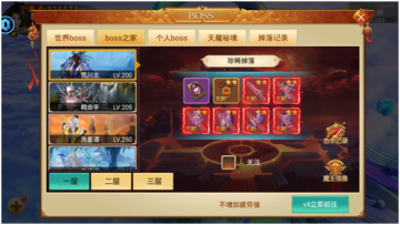 BOSS界面,通过点选BOSS查看奖励信息,已刷新的BOSS点击前往直接进入BOSS战。