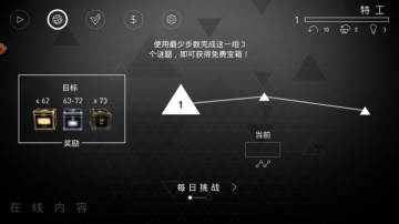 图中白色圆圈内即为每日挑战和在线谜题入口,如下图所示:每日挑战只有三个关卡。左边为每日挑战奖励内容,奖励 根据三关累计使用步数进行判断,最高可获得黄金宝箱奖励,其次为白银宝箱,最后则为青铜宝箱。宝箱内有游戏内不同数量的道具奖励哦!!