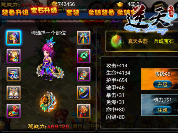 《逆天仙魔录》“强化”系统将人物强化与坐骑强化合二为一。点击坐骑装备,可以查看坐骑的四个部件等级:护铠、坐鞍、挂件、纹饰。“活动”中的“试炼场”内可以获得升级部件的材料。除去装备等级的提升,坐骑同样拥有宝石升级的玩法。和人物宝石升级的玩法相同,玩家可以选择等级升级和注魂两种方式,对坐骑的战力属性进行平衡提升,达到最佳效果。