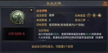 再给大家推荐一些合适的战法:五星战法【战必断金】、【先驱突击】;四星战法【落雷】/【迷阵】(一级稳定发动概率35%)、【反计之策】、【长兵方阵】、【鹤翼】、【伐谋】、【擅兵不寡】、【空城】、【闪击】。