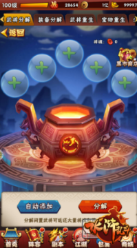 在这个“大熔炉”中,可以分别进行以下分解:“武将分解”、“装备分解”、“武将重生”、“宝物重生”、“法宝分解”、“法宝重生”。