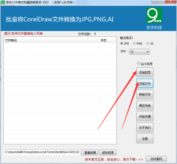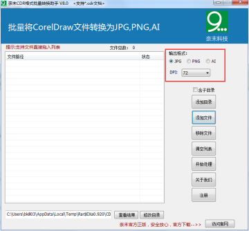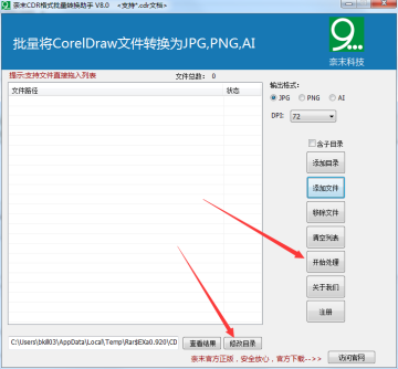 奈末CDR格式批量转换助手是奈末科技推出的一个格式批量转换器,可以快速将CorelDraw文件批量转换为JPG,PNG,AI,无需打开CorelDraw软件,可以自定义转换后图片的DPI,基本满足大部分对CDR格式批量转换的需求.CorelDraw批量转JPG,CorelDraw批量转PNG,CorelDraw批量转AI.电脑须安装CorelDraw X4版本及以上.