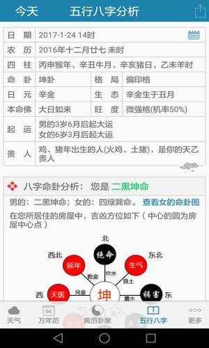 3、五行八字:专业八字算命,包括八字排盘、命卦分析、格局旺度、五行分析、大运小运、流年运程、八字论命、性格简评、健康状况、功名事业、感情婚姻、财运分析、祖业父母、兄弟姐妹、子女情况、重大关口、后天补救等十几个维度的详细分析。