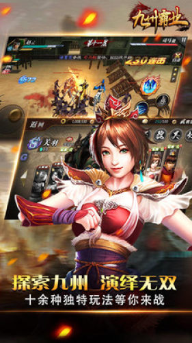 《九州霸业》是一款大型APRG动作手游。游戏以三国时代为游戏背景。在游戏中,玩家可以通过招募、任务、副本、活动获取强力的武将、装备、道具,以此来提升自己的战斗力,并最终完成魏、蜀、吴、他四个不同势力剧情任务。游戏中的任务剧情高度还原演义情节,让玩家体验到“一夫当关,万夫莫开”演义情境。通过游戏,培养了玩家乐观进取和团队协作的精神。