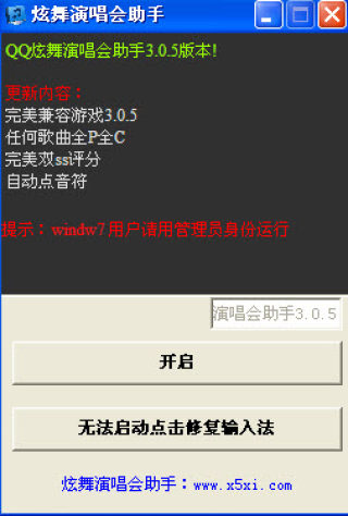 炫舞演唱会助手支持QQ炫舞3.0.5版本,支持任何歌曲全连,全歌曲双ss判断,全歌曲自动点音符,请你轻松过成就,快速提升炫舞歌手等级!炫舞演唱会助手绿色,安全,无毒,无广告!