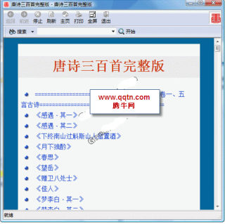 (1)浏览唐诗。点击左边窗口的唐诗题目,在右边窗口就会显示唐诗的内容,显示的内容从上到下依次为唐诗题目,作者姓名,唐诗内容,注释,韵译,评析和英译等内容,文字采用多媒体超文本显示,方便读者阅读。