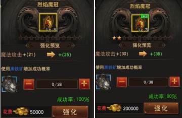通过强化装备,可以增幅装备的属性值,如果是强化武器,会增加攻击力,如果是强化防具,还会增加防御力。角色身上穿戴的十件装备都可以进行强化,特别说明的是,当“武器”强化到“+8”以上,会有炫酷的强化特效,非常拉风。