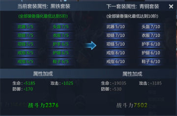 当全身装备强化最低达到对应阶数时,可激活套装属性,获得额外的属性战力加成!