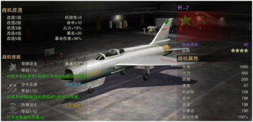 6号位:歼-7。紫机中的战斗鸡啊,有木有!有木有!即使你是非洲人,高级图纸研发也开不出这只战斗鸡,没事,分解低级图纸换也能换到,改造难度低。改造属性完美,此阵容的核心机。