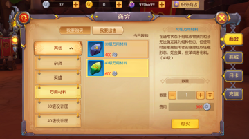 万用材料:30级、40级的万用材料直接在商会中就可以购买,更高级的万用材料则需要去副本中刷取了。