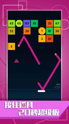 左右滑动,操纵挡板,反弹一条由小球组成的蛇,不断弹跳打砖块!