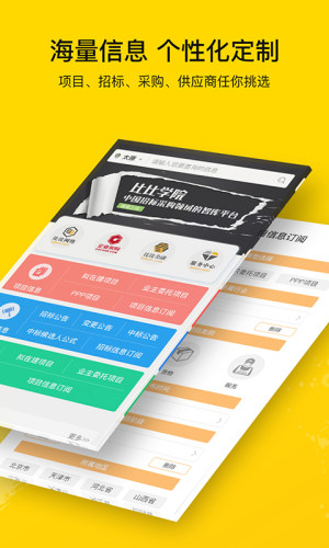(4)智能定制,同步提醒。每天通过手机即可接收您定制的招标采购项目信息进展,实时更新提醒,随时调整您的信息定制需求