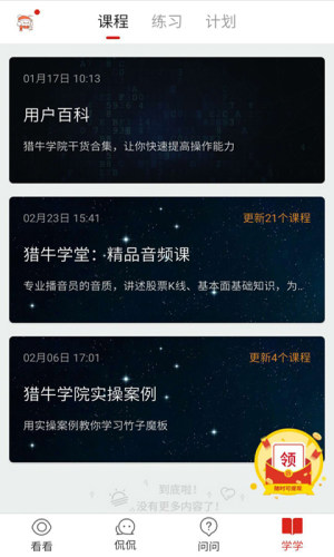 猎牛学院是一款专注于证券教育的app。使用猎牛学院软件,就能让你更好的了解到股市的行情,以及如何分析股市。让你轻松成为股场达人,想要尝试一下的小伙伴快来下载吧!