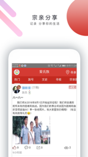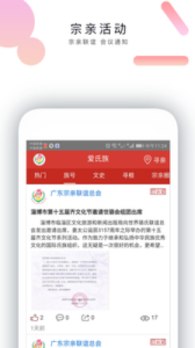 爱氏族app是一款大数据平台,平台宗亲分享,宗亲活动,寻根问祖,文化保护等诸多功能内容,爱氏族,华人氏族组织大数据应用平台,有兴趣的朋友欢迎前来下载使用。