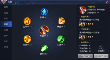 技能:通过捐献勋章来获取贡献度,使用贡献度来提升技能等级,升级公会技能可以提升玩家的角色属性,从而提升玩家战斗力!