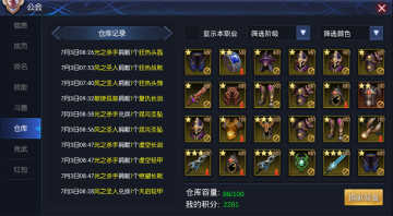 仓库:当玩家获得重复的装备或者装备不适合本职业时,玩家可以往公会仓库里捐献装备,捐献装备会获得贡献积分,而贡献积分可以在公会仓库里选择自己所需要的装备进行兑换哟~各取所需,何乐而不为呢?