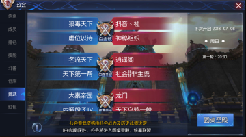 竞武:限时开放活动,全服公会进行随机匹配对战,对战开始后,玩家进入活动地图,两个公会的玩家通过击杀镇守大将以获取胜利,击杀大将的时间越快或时间结束后公会输出比越高的公会获得胜利,与小伙伴们一起为了荣誉而战吧!