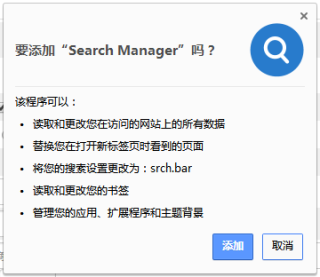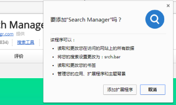 3.安装成功后再浏览器的右上方可以看到search manager的按钮,且chrome会提示新标签页被修改了。是的,search manager会修改标签页。