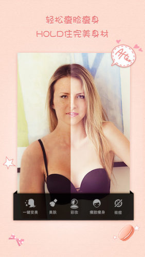 只要指尖涂抹或点触,便可轻松美白、磨皮、祛痘、放大眼睛、瘦脸瘦身,更有多款眼线和腮红,助您打造精致妆容。