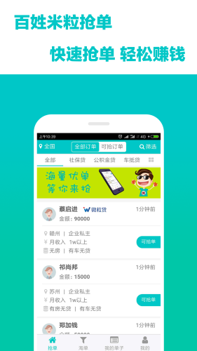 百姓米粒抢单app下载,拥有专业的信贷服务,帮助信贷经理更加高效的工作,百姓米粒抢单app拥有海量订单增加收益,还有强大的客户管理服务。
