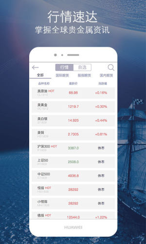 黄金白银通是您购买国内外贵金属期货的好帮手。行情一目了然,囊括国内外贵金属,外汇等期货,包括国内沪金,上证,中证,和国际美原油、美黄金、美白银美铜,德指,恒指,小道指,原油期货等国内国外期货,操作简单,好评如潮 。