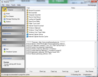 Xleaner是免费的隐私清理工具,可以清理浏览器、windows历史记录,包括浏览历史、cookies、index.dat文件、输入的url等。另外,它还支持许多第三方程序,可以清理自定义文件、文件夹或注册码。