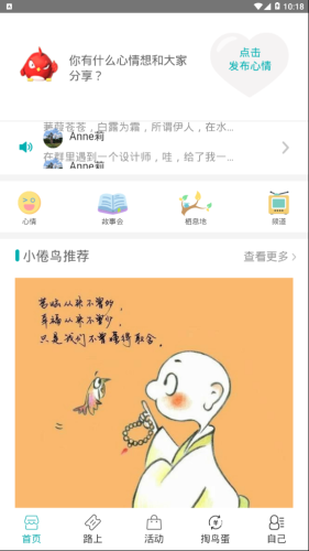 小倦鸟,不一样的社交助手。这里有故事会,有专属于你的栖息地,频道更全面,想和大家分享一下什么样的心情吗?随意分享吧。