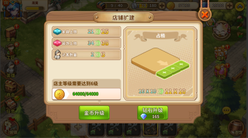 点击店铺左侧门口的木牌,或店主界面昵称右侧的扩建按钮可以对店铺进行扩建。店主每升一级都可使用金币扩建一次店铺。金币或店主等级不足时也可以直接用钻石进行扩建。