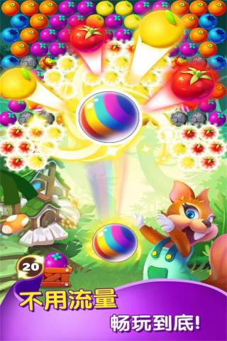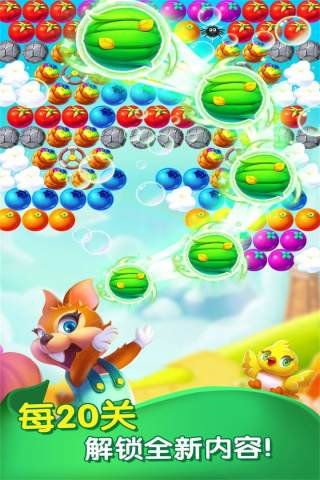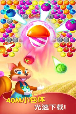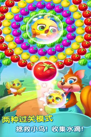 泡泡农场大作战是一款休闲的泡泡龙游戏,森林里的小鸟和水果泡泡被魔法的泡泡给困住了,需要勇敢的松鼠来拯救。于是,小松鼠开启了拯救小鸟的战斗中,为了更快地完成任务,小松鼠还必须收集各种水滴来浇灌他们的田园和农场,这样才有充足的水果泡泡来完成艰难的任务。 你有信心帮助小松鼠完成这些难关么?让我们一起克服困难,踏上这神秘而又充满困难的冒险路程吧!