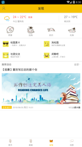 芜湖校园app是专为芜湖大学制作,软件拥有兼职、交友、购物、二手等诸多功能板块,可以帮助用户更好的芜湖大学生活学习,觉得不错的朋友欢迎前来下载使用。