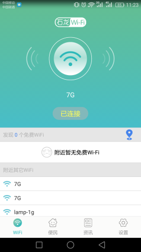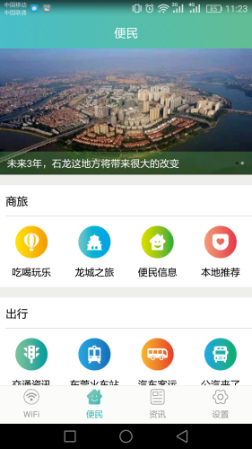 东莞石龙镇便民app主要包含了Wi-Fi连网、便民、资讯、设置四大块的功能。