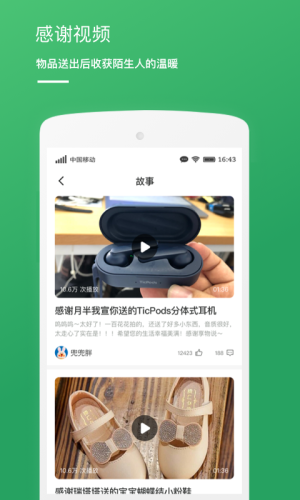 30秒发布宝贝,平均2天送出。没有讨价还价,没有现金交易,通过小红花积分实现物品在人与人之间的高效流通。获赠人会通过视频感谢赠与人,构建了一个有爱互助、有温度、有故事的社区。