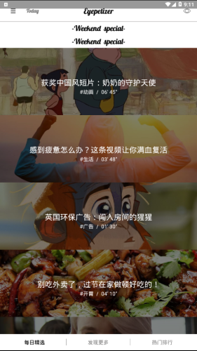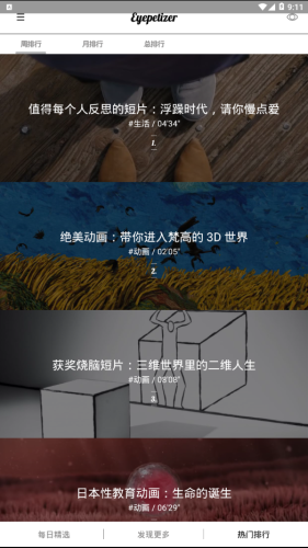 OpenEyes app,高清精致的短视频在这里,每日精选,发现更多内容,热门排行。这是一个能够让你静下心来的短视频应用,远离喧嚣远离世俗。
