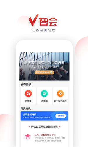 V智会app下载,智能化信息化的会议服务系统,帮助用户更加轻松简单的办会议,V智会app从组织策划到场地租赁到会务管理,一站式服务平台。