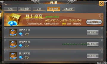只需要300钻石便能分别在一个月内获得总值2100的绑钻,七倍的收益。平时绑钻我们可以用来买鼓舞、离线挂机卡、复活、进阶丹等等必备的东西。所以月卡投资是绝对不会亏的,必买!