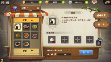 玩家可以通过商城购买的材料或玩法产出的材料来制作料理。料理分为1个境界,通过制作低级料理增加熟练度去提升境界,达到高级境界后可解锁新的料理。玩家追求高级材料来制作高级料理,从而在战斗中达到逆转乾坤的作用。