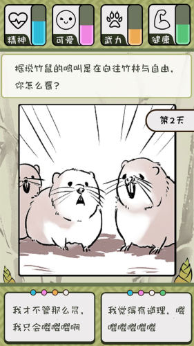 竹鼠活下去是TOT工作室最新推出的一款别样玩法养成手游,游戏中玩家居然会成为一只竹鼠,有四大属性,分别是精神,可爱,武力,还有健康。玩家不断的过各种剧情,每一个选择都会影响到这四个属性,如果属性过低,是会被吃掉的,你能活下来吗。