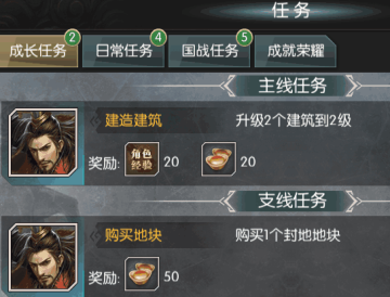 任务分为:成长任务、日常任务、国战任务以及成就系统;