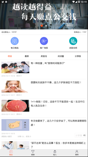 “将你感兴趣的文章分享到社交圈,好友阅读了就能获得平台奖励,根据友好的阅读人数来统计你的收入。”