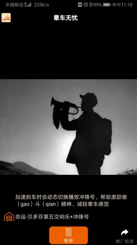 晕车无忧App智能感知音乐系统,根据感知技术,检测汽车的加减速度,动态播放音乐、超跑声浪、音效,有效帮助舒缓晕车。