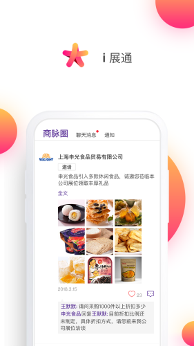 i展通着重强调业内人士及普通消费者和企业及商家之间的直接沟通,集合了商家介绍、产品展示、即时通讯和留言回复等功能,是一款商业社交软件。