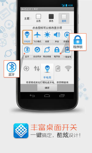 1、桌面插件:一键开关WiFi、飞行模式、调整亮度、铃声音量、重力感应、蓝牙、同步、2G/3G移动网络、程序锁、GPS定位,多种桌面插件风格可供选择;