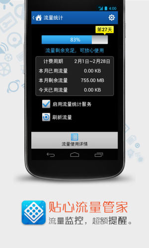 3、流量统计:统计当日、本周、本月已用流量,设置包月上限;
