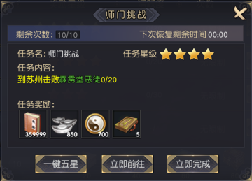 玩家等级达到15级后将会自动承接师门挑战任务。师门挑战任务默认储存上限为10次,次数不满时,每一小时恢复一次任务次数。玩家完成任务内容后,通过点击任务追踪调出师门挑战界面。在界面上可进行领取奖励、花费绑金立即完成、花费绑金一键五星、立即前往等功能。任务的奖励与任务的星级成正比,每个任务对应的星级为随机。