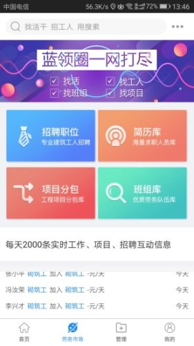 蓝领圈APP为施工单位、劳务公司、班组长、工人,提供从招工找活、项目分包、劳务管理、数据共享等服务为目标的建筑劳务生态圈服务平台。