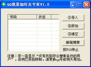 QQ批量加好友专家是一款批量管理qq好友软件,可以批量导入,批量添加qq好友,加qq好友利器,更换qq号码或qq被盗qq好友就没了,所以用“导出QQ好友工具”,把qq好友做个备份,然后再用本软件批量添加,这样qq好友又回来了,从此不怕qq好友丢失了!