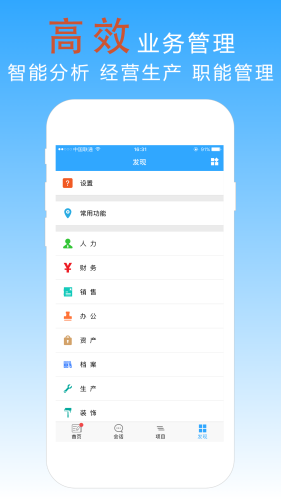 业务管理:围绕项目型组织的运作以及业务管理,提供人力资源、财务网报、资产管理、销售管理、协同办公、生产管理等业务系统。企业(组织)以及业务资讯及时查阅,事务即随时审批,让办公以及业务管理无界。