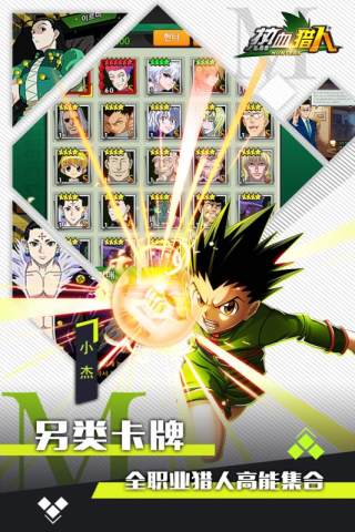 真正的猎人,永远对猎物保有一百分的警惕,一场精彩的狩猎,才刚刚开始…… 《热血猎人》是一款由日本经典猎人漫画改编的超燃卡牌对战手游,游戏以原版漫画剧情为背景,构筑起一个弱肉强食的猎人世界。游戏完美融合RPG、卡牌养成、休闲游戏等多种游戏玩法,玩家可以随心玩出自己的风格!热血激燃的combo对抗,华丽无双的大招特效,战斗快感无限UP!更有风格迥异的章节副本、擂台赛、跨服赛、世界boss等诸多挑战等你.