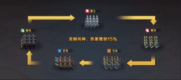 游戏的克制线是步兵克制骑兵,骑兵克制策士,策士克制盾兵、盾兵克制弓兵、最后弓兵克制步兵形成一圈循环,如果一场战斗能很好的利用克制,等于直接提升了10%左右的战力了!!!